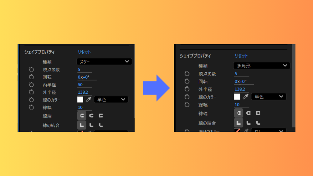 ◇五角形のサイズを変えたい場合は、同じくシェイププロパティ内にある外半径を調整する。