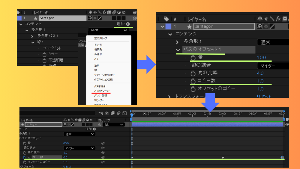 出典:Adobe After Effects(© Adobe Inc.)A.【追加:▶】のボタンから、「パスのオフセット」を選択