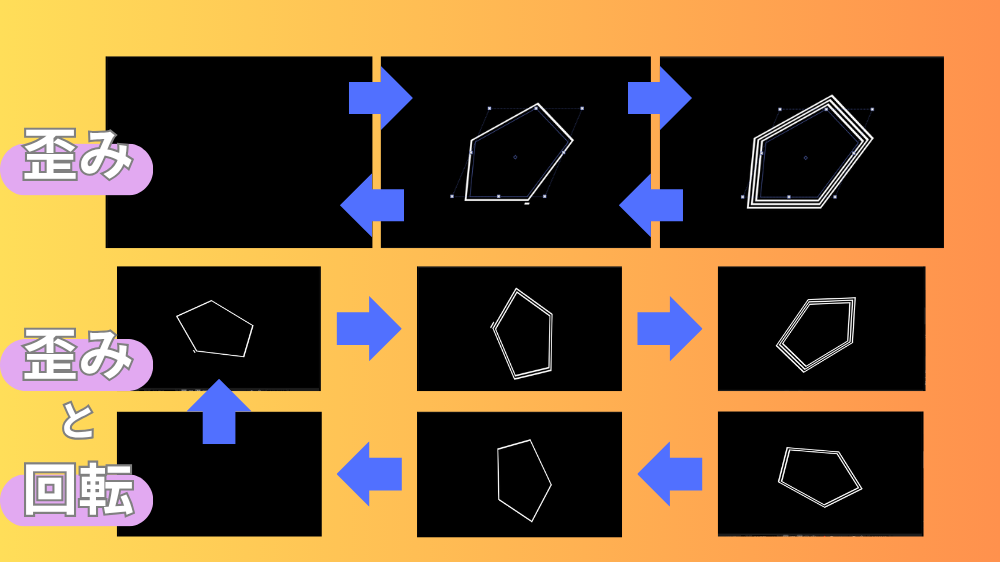 「図形が外側にズレながら描かれ、内側にズレながら消えていくアニメーション」が完成です。