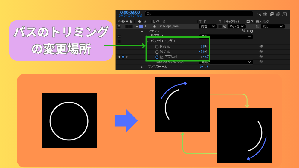 ✅シェイプ(区別のためにTip Shape_baseに名前変更)>コンテンツ>パスのトリミング1>オフセット⇒ストップウォッチをクリック